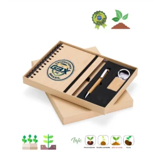- Kits ecológicos com sementes, blocos reciclados e lápis plantáveis
