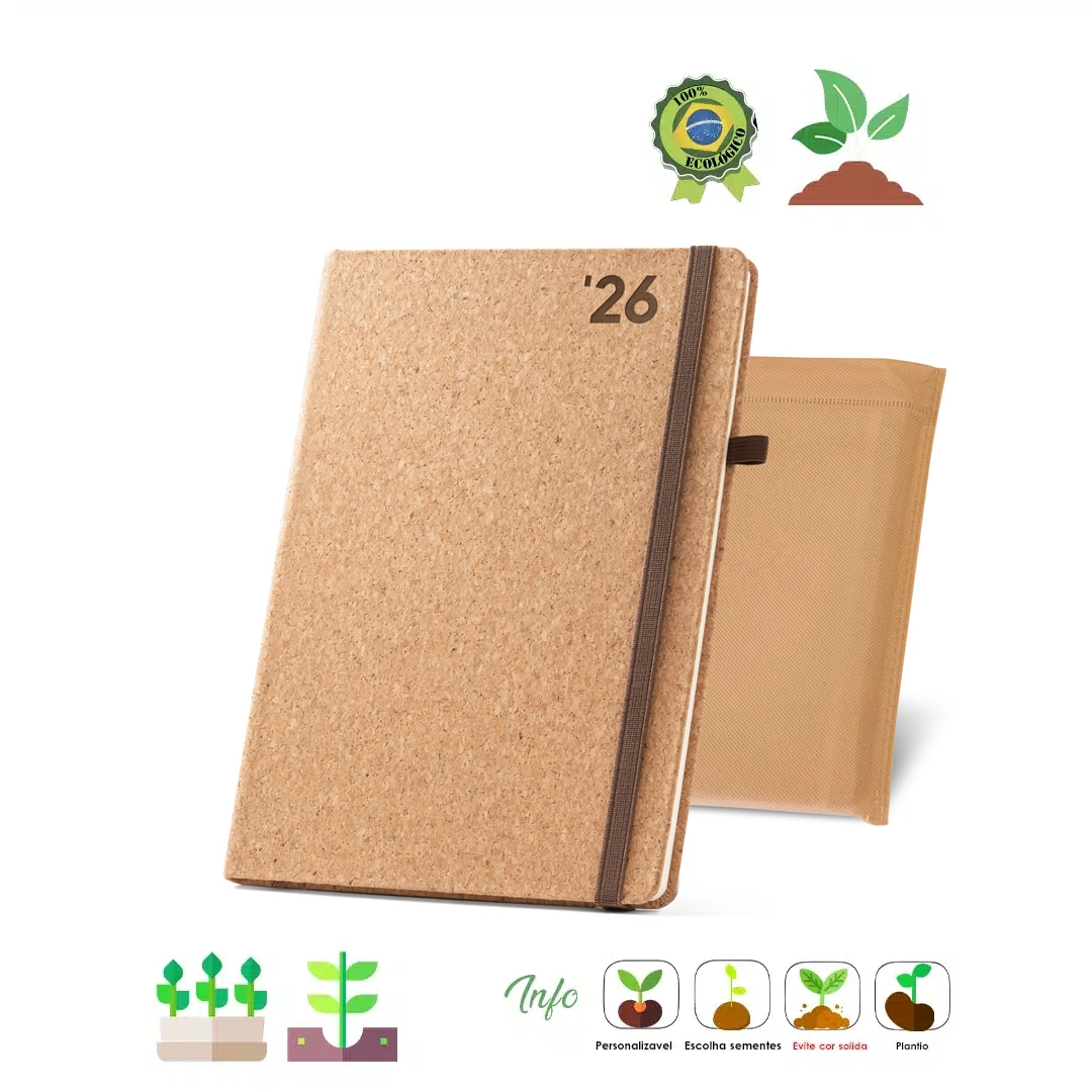 Agenda ecológica em cortiça natural no formato B5, ideal para anotações diárias e planeamento semanal. Possui suporte para esferográfica (não incluída) e marcador em fita para maior praticidade. Papel de 70 g/m² com organização em plano semanal. Acompanha bolsa em non-woven para proteção e transporte. Dimensões: 175 x 245 mm | Bolsa: 220 x 270 mm.